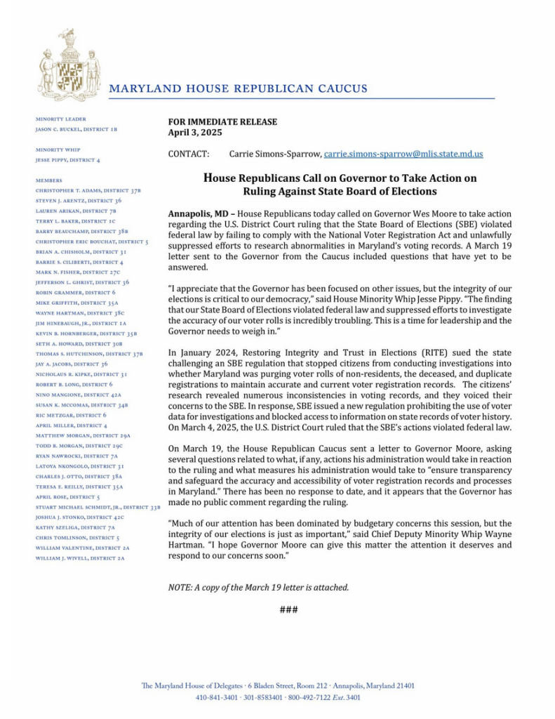 Annapolis, MD – House Republicans today called on Governor Wes Moore to take action regarding the U.S. District Court ruling that the State Board of Elections (SBE) violated federal law by failing to comply with the National Voter Registration Act and unlawfully suppressed efforts to research abnormalities in Maryland’s voting records. A March 19 letter sent to the Governor from the Caucus included questions that have yet to be answered.